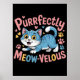 This charming graphic features a contented blue and white striped cartoon cat in a playful, crouching stance, with bright yellow eyes and a happy, open-mouthed expression. The bold text above, "Purrfectly MEOW-VELOUS," is rendered in cheerful pink hues, accented by floating hearts and paw prints in various colors, adding to the joyful theme. The design is set against a solid black background. Digital download for personal use only.