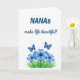 This greeting card features a centered message near the top in deep blue, with the first word set in thick, simple uppercase letters and the rest in a flowing, cursive-style look that feels like a gentle hug ❤️. The text sits against a bright white background, leaving plenty of open space so the words feel calm and easy to read. In the lower third, a soft watercolor garden scene spreads out like a quiet moment shared between loved ones. Three five-petaled flowers in translucent light-to-deep blues cluster together, as if leaning in close like friends swapping sweet stories. Below them, slender green grass strokes fan outward, adding a fresh spring touch 🌼. Two small winged insects hover above the blooms, their pale blue wings echoing the petals as they drift in a slow, affectionate dance. The blue lettering at the top contrasts sharply with the white space, while the flowers and grass gather in a neat band along the bottom edge.