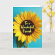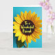 This card features a large sunflower filling most of the frame, shown up close so the petals seem to reach toward the viewer like an affectionate gesture ❤️. Bright yellow petals spread evenly around a dark, textured center, creating a cozy focal point that feels like a warm hello between friends. Across the center of the flower, the words “To a Wonderful Friend” are placed right over the seed-filled core in flowing yellow lettering that stands out against the darker background. The light is soft and even, gently shaping the petal edges so they look velvety and calm rather than harsh. Behind the bloom sits a smooth turquoise backdrop, like a clear summer sky that makes the yellow glow feel sunny and inviting 🌼. In the lower left, a green stem angles upward with a single leaf, adding a grounded, natural touch. The flower’s center shows tight spirals of tiny seeds, giving the eye a quiet path to follow. A small green leaf and stem emerge from the bottom-left corner against the turquoise background.