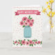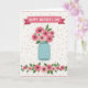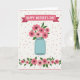 This card features a sweet bouquet of stylized flowers in soft pink tones, each bloom showing a darker detailed center that adds a tender, romantic touch ❤️. The flowers sit in a simple light blue jar with gently defined edges, while fresh green leaves curl and overlap like they’re leaning in close together. Near the top, a rosy pink banner stretches across the design and holds the message in crisp white lettering, drawing the eye first. The background is a creamy off-white field sprinkled with soft pink polka dots that vary slightly in intensity for a light, affectionate texture 🌼. Along the lower area, a decorative border repeats small pink flowers and green foliage, grounding the composition and framing the bouquet. The colors stay calm and cozy, with blush pinks, cool blues, and leafy greens balancing each other without feeling busy. The jar sits centered beneath the banner, with the floral border running horizontally across the bottom edge.