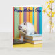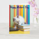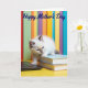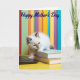 This card shows a fluffy, light-colored kitten with darker tips on its ears and nose, gazing slightly off to the side with bright blue eyes that feel like a sweet, curious glance shared between close friends ❤️. The kitten sits in the lower middle of the design, one tiny paw resting against a dark, sleek device while the other settles on a short stack of two books. One book is a calm light blue, and the other is a warm tan shade, adding a cozy, lived-in touch like a quiet moment spent together. Behind the kitten, the background fades into soft vertical stripes that resemble rows of colorful books, with greens, yellows, purples, and blues blending gently. The scene rests on a sunny yellow surface that makes the fur and books look extra soft and inviting 🌼. Near the top, a short seasonal message appears in deep blue lettering, centered and easy to notice against the lighter backdrop. Gentle lighting highlights the kitten’s plush texture while the smooth covers of the books catch a subtle sheen, and the blurred stripes stay softly out of focus in the distance.