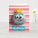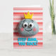 This greeting card shows a studio-style portrait of a cute, stone-textured character centered against horizontal stripes that alternate white and warm coral. The figure has a mottled gray surface with smooth facial features, and its big glossy black-and-white eyes and tiny eyelashes give it an affectionate, wide-eyed look ❤️. A small upturned smile and rosy, glittery cheeks suggest a friendly blush, like it’s reacting to a sweet compliment. On top sits a shiny yellow crown that catches the light and adds a gentle, celebratory touch. Below the character, chunky 3D letters in bright azure blue are placed near the bottom and form a short message that plays on the character’s rock-like look. Soft, even lighting keeps the scene bright with almost no shadows, making the textures and colors feel cozy and inviting 🌼. The background stays simple and graphic, with the coral-and-white stripes running straight across behind the crowned figure.