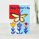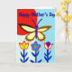 This greeting card features a bright, graphic illustration that leads your eye from simple flowers up to a winged creature, creating a friendly, affectionate mood ❤️. Near the upper middle, a large butterfly with a deep purple body and antennae spreads wide wings filled with creamy yellow sections edged in dark brown. The lower edges of the wings are slightly jagged, adding a natural touch to the otherwise smooth shapes. Behind it, a sky-blue field meets a curved band of strong red, like a sunrise that makes the scene feel warm and welcoming. Along the bottom, three simplified flowers stand side by side on dark indigo stems with small, minimal leaves, as if they’re leaning in close like companions. Their petals mix bright contrasts—one yellow, one blue with orange, and one white with purple centers—each outlined in red, with a tiny 🌼 detail tying the garden feel together. Across the top, a short message appears in light blue lettering, positioned above the butterfly against the blue-and-red background. The flowers sit in a neat row with matching dark stems, while the butterfly hovers above them against the split sky-blue and curved red backdrop.