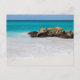 A postcard with a beautiful photograph. A white sandy beach, with a gentle surf. Tropical turquoise water surrounds a jagged rock.