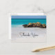 Thank You postcard with a beautiful photograph. A white sandy beach, with a gentle surf. Tropical turquoise water surrounds a jagged rock.