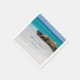 Paper napkins with a beautiful photograph. A white sandy beach, with a gentle surf. Tropical turquoise water surrounds a jagged rock.