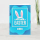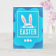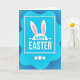 This design shows a layered blue scene where an organic, rounded azure panel seems to hover over a deeper navy background, with soft shading that adds gentle depth. Centered on the lighter panel sits a crisp white rectangular frame that draws your eye in like a little stage. Inside it, two long white bunny ears rise from a curved base, with pale pink inner details that suggest a shy, affectionate closeness 🐰. Just beneath the ears, a seasonal greeting appears in white sans-serif letters, set neatly in the middle so it stands out against the blue. The overall palette stays mostly blue and white, warmed by the small touches of pink that soften the look 🌷. Near the bottom edge, three small white circles line up in an even row as simple decorative accents. The darker blue background surrounds the floating panel, and the white frame, ears, text, and three circles remain sharply defined against it.