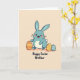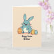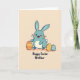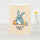 This card shows a cute, human-like bunny in a soft azure blue, stepping forward as if heading toward a friend with an open, welcoming grin 🐰. Its wide dark eyes and lightly rosy cheeks give it a tender, affectionate look, and a small fluffy white tail peeks out behind. Three decorated eggs sit nearby like cheerful companions, adding a cozy, togetherness-in-the-air mood to the scene 🌷. One egg is orange with zigzag lines, another is yellow with a wavy pattern, and the third is light blue with dots and thin horizontal stripes. The background is a muted peach tone that keeps everything gentle and easy on the eyes while still letting the pastel colors stand out. Beneath the illustration, a short seasonal greeting is centered in rounded lettering, set in a darker tone that contrasts clearly against the peach. The bunny and eggs are outlined with smooth, dark lines, and the eggs are arranged around the bunny against the soft peach backdrop.
