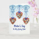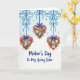 This card features three heart-shaped floral ornaments hanging from soft blue ribbons, arranged in a gentle arc that feels like close friends leaning toward one another ❤️. Each heart is filled with tiny white, blue, and deep red blossoms tucked into leafy green sprigs, suggesting a tender closeness through their shared garden-like details. The background stays a warm sandy tone, giving the scene a cozy, sunlit setting that makes the colors feel inviting rather than loud. A strong red outline frames the whole design, adding a confident border around the softer interior artwork. Near the top, curling blue decorative lines sit like delicate metalwork, and small red dots are scattered nearby like little confetti moments 🌼. Along the lower portion, a short Mother’s Day message appears in deep blue lettering, centered and easy to notice against the light background. The three botanical hearts are slightly varied in placement, with the middle one set a bit higher, and the ribbons angle upward to a neat row of blue curls above.