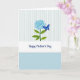 Designed with a softly romantic touch, this card features a stylized sky-blue rose with gently unfurling petals placed in the upper-middle area. Nestled close to the bloom is a deep-blue butterfly, angled as if sharing a quiet moment with the flower ❤️. The scene is lit with diffused, springlike light that keeps the blues airy and the greens of the leaves fresh and calm. Beneath the flower-and-butterfly arrangement, the words “Happy Mother’s Day” appear in flowing deep-blue lettering, centered and easy to read. The background transitions from a pale, vertically striped area at the top—like light fabric—to a smooth, soft-azure field below, adding a tender sense of closeness to the composition 🌼. A crisp white scalloped border separates the two sections, resembling delicate lace trim. The butterfly’s rich sapphire wings stand out against the softer rose tones, with fine wing details visible near the edges.