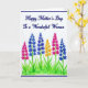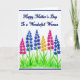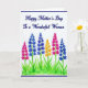 Designed with a white background and a deep indigo border, this Mother’s Day card feels calm and affectionate from the first glance ❤️. Near the top, the message “Happy Mother’s Day To a Wonderful Woman” is centered and written in deep blue lettering that flows smoothly across the open space. The airy layout leaves plenty of breathing room, like a quiet pause before a warm hug. Below the text, a small garden scene spreads across the lower portion, where seven tall flower spikes rise from short, fresh green grass. The blooms mix royal blue, bright fuchsia, and golden yellow, and their clustered petals lean and lift in slightly different directions, suggesting a gentle closeness like friends standing shoulder to shoulder 🌼. Slender green stems and soft watercolor layers create tender edges, as if the flowers were painted with a light, careful touch. At the bottom, the grass is shown with quick green strokes, and the seven flower spires vary in height against the white space.