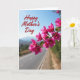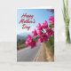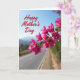 Designed with a sweeping branch of bright pink blossoms in the foreground, the card shows papery petals and tiny golden centers catching the sunlight like a gentle embrace ❤️. The flowers angle diagonally across the scene, creating a romantic sense of closeness as they lean toward the open sky. Behind them, a wide blue sky stretches clear and calm, making the pink tones stand out strongly. Below the blooms, a quiet gray road runs into the distance, guiding the eye toward soft, hazy hills and a faint cluster of buildings. The background is softly blurred so the blossoms feel nearer, like a caring presence close to your shoulder 👩. Near the upper left corner, the words “Happy Mother’s Day” appear in red, flowing lettering that sits lightly against the sky. The pink flowering branch crosses the frame from the lower left toward the upper right, with sunlit petals sharply detailed against the smooth blue backdrop.