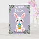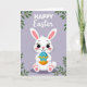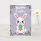 This card features a stylized white bunny with soft pink inner ears, wide eyes with tiny lashes, and rosy cheeks, giving it a sweet, friendly look 🐰. The bunny’s small smile and the way it cuddles an oval egg close to its chest suggests a tender, affectionate moment, like it’s holding a gift for someone special. Behind the character is a smooth lavender background that keeps the scene calm and springlike. In the upper corners, light green leafy branches curve inward, framing the bunny as if it’s sitting under fresh growth. Near the top, a short seasonal greeting appears in white text, centered and spaced so it floats neatly above the illustration. Gentle shading around the bunny and egg adds depth without making the art feel heavy. The egg is bright blue with scattered white dots and a sharp orange zigzag band around its middle 🐇.