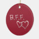 The letters BFF and linked hearts in a pink watercolor. Customize the background color and the names on the back of the ornament.