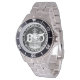 Has heft and feel of expensive stainless steel quartz watches. Good band with safety catch. I removed links, which is easy because engraved arrows show direction to push the linking pins. As always by this seller, the image (a railroad logo) is a perfect reproduction of my emailed image, and is precisely spaced and aligned.