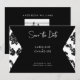 Black & White Damas Photo Wedding Save the Date. Back with Bride and Groom Photo last names as well as the text Wedding. Website. Black and white filter applied to photo.