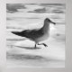 A seagull walking through the foam from a wave washing up on the beach in black & white.