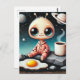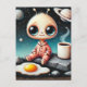 A funny baby Alien dressed in pink pjs with a morning coffee and a fried egg sitting on a rock