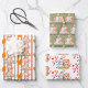 Baby animals are featured on this set of Valentine wrapping paper. A mama and baby giraffe pattern are overlayed on color coordinated stripes. A baby elephant and giraffe pattern with a Valentine message. The third design is a baby zebra and baby tiger with hearts and a messages that reads “Happy Valentines Day”.