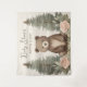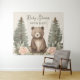 This charming woodland baby shower design brings cozy forest magic to any celebration! A sweet, wide-eyed baby bear cub sits centered with a gentle expression, surrounded by tall, stylized evergreen trees in soft sage and gray-green tones. Delicate pink peonies, creamy roses, and tiny white blossoms frame the bottom, while subtle greenery and berries add layered texture and natural warmth against a light, dreamy backdrop.