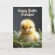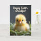 Designed with a fluffy yellow chick centered in a nest of soft green grass, this card draws your eyes straight to its gentle, forward-facing gaze. The chick’s down looks almost glowing, with glossy dark eyes that feel like they’re meeting yours in a quiet, friendly moment 🌷. A small orange beak adds a warm contrast against the sunny feathers, while the surrounding blades of grass blur softly as if leaning in like a protective hug. Behind the nest, the background fades into deep charcoal tones, making the bright chick stand out even more. Near the top, a seasonal greeting is printed in creamy white, flowing lettering, set clearly above the image without covering the chick 🐇. The light is soft and diffused, bringing out the fine texture of the chick’s feathery coat and the tender curve of the nest. The green blades form a loose ring around the chick, with a few tips catching the light against the dark backdrop.