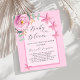 A pink background with an arch. Decorated with a pink floral, rose flower, green watercolored eucalyptus greenery and butterflies. Personalize and add the name of the mom to be and party details. Text: Baby in Bloom.