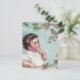 Small child intently gazes at Bluebird chirping on a flowering tree branch. Vintage design is pretty in soft aqua and pink colors.