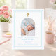 A white background, decorated with a baby blue frame, and a golden cross Personalize and add a photo name and details. Blue text. Arch shaped photo frame.