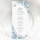 Baby blue, silver and white Quinceanera celebration slim menu card. Features, script font, silver butterflies, watercolor roses and tiara. Perfect for an elegant princess style glam celebration. Personalize with your own details.