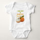 New baby born in autumn / fall one piece t-shirt. Pumpkins design with text that reads, "I was born in pumpkin season". Colors are orange and green and all text is in template form to change or delete as you choose.