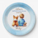 Blue and brown boy's baby shower paper plates. Cute watercolor baby boy and a Corgi Puppy by his side.