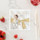 Beautiful vintage baby in christening suit on a white satin background with gold ribbon.