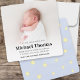 Announce your little one's arrival in style with this adorable baby boy announcement template! Featuring a modern, minimalist design, this card highlights a full-bleed photo layout and soft blue striped background with delicate periwinkle, yellow, and blue sky stars. The layout provides space for baby’s birth stats in a trendy, easy-to-read font, creating a timeless yet fresh aesthetic. Perfect for showcasing your baby boy’s first photos, this simple yet elegant card is a beautiful way to share your joy with family and friends. Customizable for a unique, personal touch!