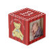 Create a precious keepsake in celebration of your baby's first Christmas. Replace the two sample photos with your own baby's photos and personalize with your baby's name, monogram initial and year of first Christmas. Front of cube has a sweet bear with a blue bow. Background is red on red stripes. Photography © Storytree Studios, Stanford, CA