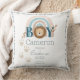 This custom keepsake baby pillow features a cute watercolor style bohemian illustration. The word Boy has a little lion head in the center, with a boho rainbow in the background. Cute lion cub paw prints are printed along the side. A sample name is printed below the lion, followed by the newborn baby's birth details. The date, time and weight are listed. You can personalize the pillow to include your own custom name and other text.