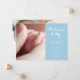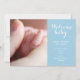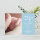 Welcome baby boy birth announcement card to introduce your beautiful newborn baby boy. The front includes a baby photo and a script welcome message, name and birth stats on a baby blue background. The reverse has three further baby photos and includes a charming blue and white monogram initial of your babies name. Designed by Thisisnotme©