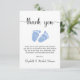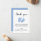 A sweet baby boy shower note card with "thank you" in a stylish script with swashes and a cute blue watercolor illustration of baby feet. Underneath you can easily personalize your thank you message or leave blank for a handwritten note.