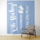 A cute baby boy shower welcome backdrop tapestry with "Oh Baby!" in a stylish white script, a white illustration of baby feet, and the mother-to-be's name in white script, all against a pastel blue background.