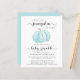 A cute, cheerful and budget-friendly baby boy sprinkle by mail invitation featuring "A Sweet Little Pumpkin Is On His Way" written in a mixture of soft grey modern typography and stylish script with swashes, and a pastel blue watercolor of a pumpkin. Personalize the mother's name and sprinkle details in simple grey typography.