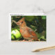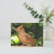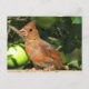 This postcard features an adorable baby Northern Cardinal. He is all golden and brown with a tan beak now, but when his adult feathers grow in, he will be a brilliant red bird with an orange beak. He is sitting on a rail in front of a tree full of green apples looking a little bit confused.