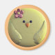 A cute yellow baby chick with a pink flower on top of her head. An adorable baby chicken.