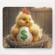 A fluffy chick sits in a nest, holding an egg with a large green dollar sign