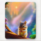 A adorable baby chipmunk in a tree and a rainbow background.