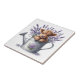 This ceramic tile is shown with a cute baby cow in a farm water can with lavender art print.