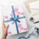 Baby cowgirl wearing pink cowboy hat and pink cowboy boots and a toy horse by her printed on gift wrapping paper. Text says Cowgirl Cutie.