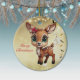 Celebrate the holiday season with this gold festive round ceramic ornament featuring an endearing woodland forest animal cartoon graphic of a cute baby deer with poinsettia flowers tucked in the fawn's ear, and Merry Christmas written in red. Perfect for decorating your tree or as a thoughtful gift, this whimsical floral doe decor makes a cherished keepsake for years to come. Customize by changing the text, the font, the font color, or remove the text. You can even transfer this design onto other products. Enjoy this design your way! Check out ForestBabies Xmas Deer Collection for matching decorations. 🎄🦌