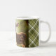 A lovely mug for wildlife lovers, featuring an AI-generated realistic digital painting of a baby deer near a mountain stream. Plaid border and room for personalization,
