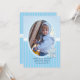 A sweet juvenile photo invitation with blue and grey stripes, an oval photo window and a little elephant motif.