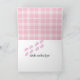 Newborn baby footprints in congratulations text on a pink and white plaid background for new baby girl.