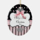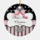 This Baby's first Christmas ornament features elegant French copperplate swirls, black, pink and green dots in the background and a beautiful hand painted pink bow. All made from original artwork by Audrey Jeanne Roberts. The result is a beautifully contemporary Baby gift. On the reverse side there is the same dot pattern on a white background and a bracket revealing a place for your baby's photo. You can easily add your own picture or change the message. YOU MIGHT ALSO ENJOY: